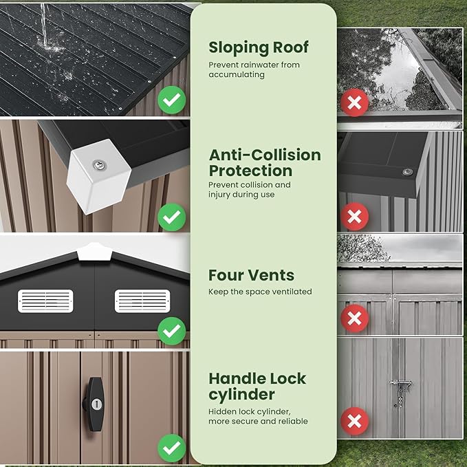 - All-Weather Shed - GVDV storage house is designed with a sloping roof to safeguard your stored items from potential damage caused by stagnant water. The ventilation design is essential for keeping items dry, especially in environments where varying temperatures and humidity levels are common. The plastic/screw protection shell minimizes the risk of accidents during everyday use. A dependable lock mechanism offers a robust safeguard against unauthorized access.