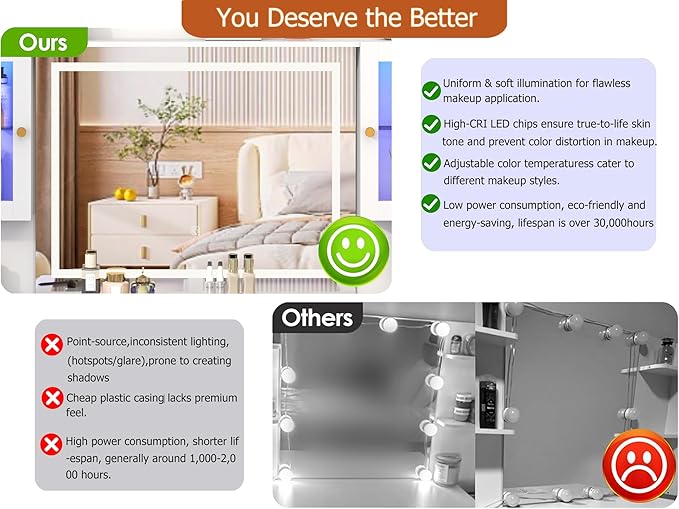 - Vanity Desk with 60,000-color LED RGB Cabinets: Our led vanity come with 2 RGB clear tempered glass cabinets which has 60,000 color led lights and multiple lighting modes, like timing function, music sync, mic sync,tec. for choose, you can control it via APP or RF switch. Provide you a stunning visual and immersive experience while you relax or entertain.
