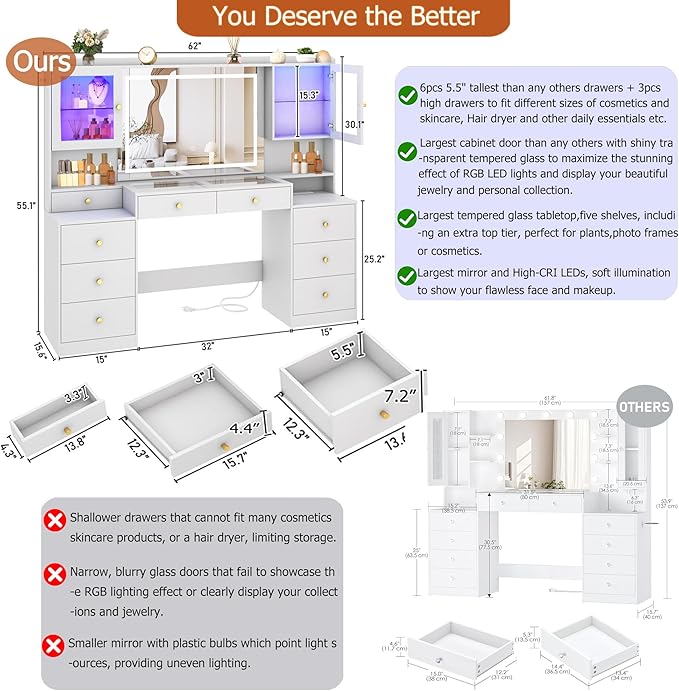 - 62 inch Large Vanity with Powerful Storage Capacity: 62 inch large table top makeup table with 9 drawers,2 RGB cabinet and different size open shelves also includded top of it provide enough space for your favorite jewelry, hair accessories, hair care products and cosmetics,make your desktop more tidy and clean.The back of the vanity contains an anti tipping device wihch protect your kids and pets.
