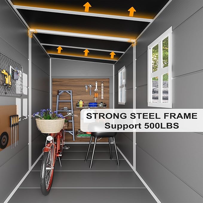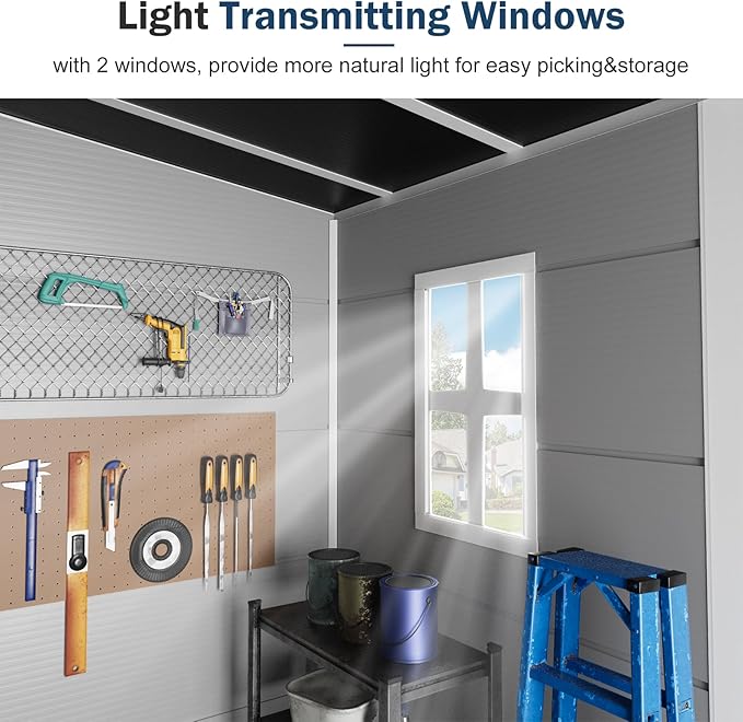 - Floor &Windows Inlcuded : The extra-wide front double doors for greater flexibility in organizing and accessing items, included shed floor,built-in ventilation prevents mold and mildew growth, enhanced safety for tools and equipment with lockable doors, Included D-Clip wall anchors to support shelves & hangers