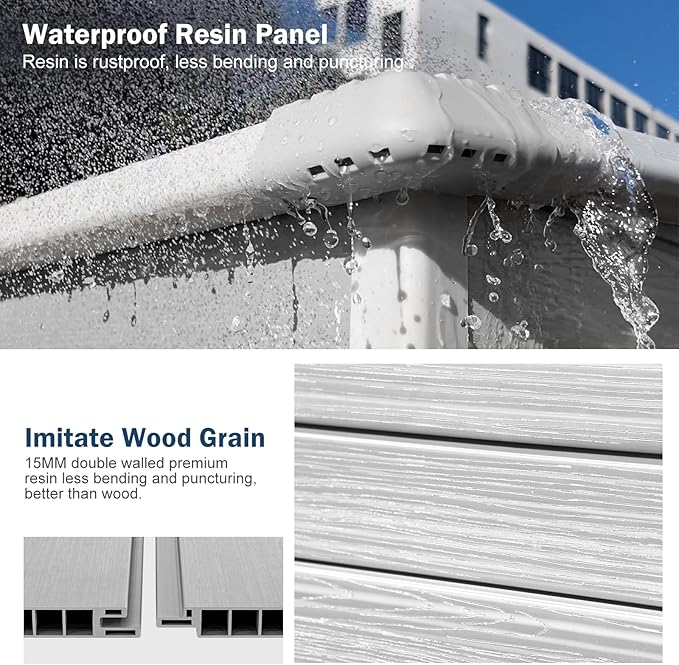 - WATER RESISTANT: Resin and plastic mix material with painted outter, make the shed waterproof. All parts are plug in tightly. We also provide silicone sealant to make the panels fit more tight and prevent potential leaks
