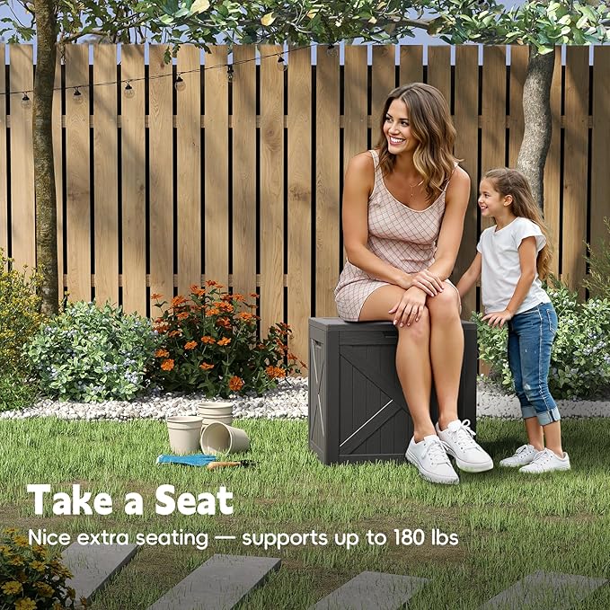 - Heavy Duty and Multi-Functional: Constructed from high-strength resin, this deck box supports up to 180 lbs. It can double as a patio side table or bench, providing versatile and ample storage in any outdoor space.