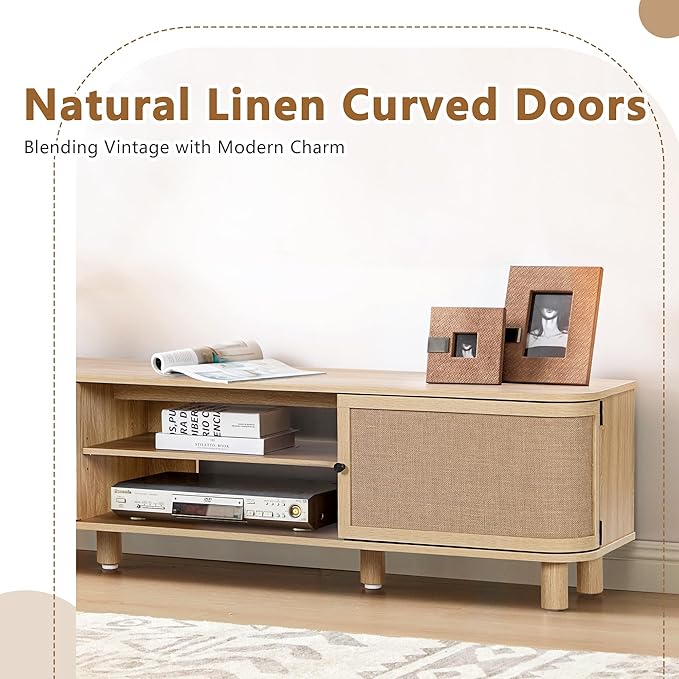 - Mid-Century Design: Enhance your space with this elegant wooden TV stand, featuring softly curved edges and natural linen-textured doors. Its warm wood finish and minimalist silhouette blend seamlessly with both classic and contemporary decor, adding a touch of refined style to any room. Ideal as a living room TV stand or a farmhouse-inspired entertainment center for the bedroom.