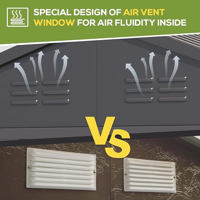 - Robust and Resilient: Enhanced metal plates contribute to the shed's weight of 312 lbs, surpassing cheaper alternatives and significantly reinforcing stability. Withstanding severe weather conditions, it exhibits exceptional wind resistance, reaching approximately 70 mph.