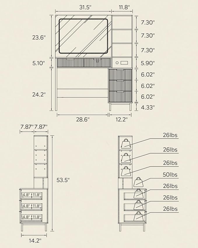 - Vanity Desk with Super Large Mirror: Fluted vanity desk with mirror and lights offers a super large 31.5" size mirror, which can ensure a true and accurate reflection, 3 colors and brightness adjustable for flawless makeup application. You can adjust the lighting color or brightness according to different scenes and makeup needs by pressing the button