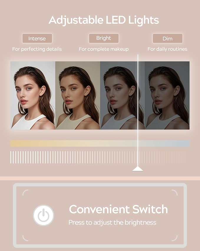 - Perfect Dimension Excellent Service: The overall size of the makeup vanity desk with lights is 15.75"D x 43"W x 53"H, the width of the natural vanity top is up to 43". If you have any questions, please do not hesitate to get in touch with us for a satisfactory answer. Just click "contact seller" to get satisfied solutions, no cumbersome returns.