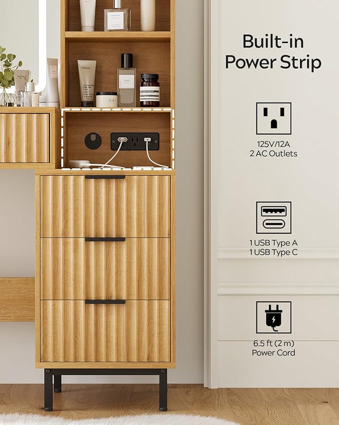 Fluted Vanity Desk with Large Mirror and Lights, Modern Wood Makeup Vanity Desk with Glass Top, Charging Station, 5 Drawers Adjustable Open Shelves, Dressing Table Set for Bedroom, Natural Oak