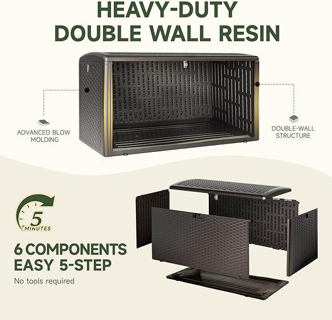 - VERSATILE STORAGE SOLUTION: Perfect for tidying up patios, pool areas,decks, and gardens. lt securely stores outdoor cushions, gardening tools,seasonal items. The weatherproof design works great indoors and out.