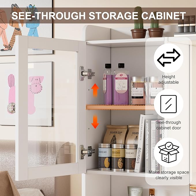 - 【Powerful Storage Space & Glass Door Cabinet】This large makeup vanity will let you say goodbye to cluttered storage. 8 drawers, spacious tabletop, side open shelves and 2-tier hidden storage shelves with glass door hold all your cosmetics and other beauty essentials, In addition, the drawer cabinet is designed at a height that can be used as a nightstand. The two drawers on both sides have additional storage shelves above, which is convenient for you to store some daily items.