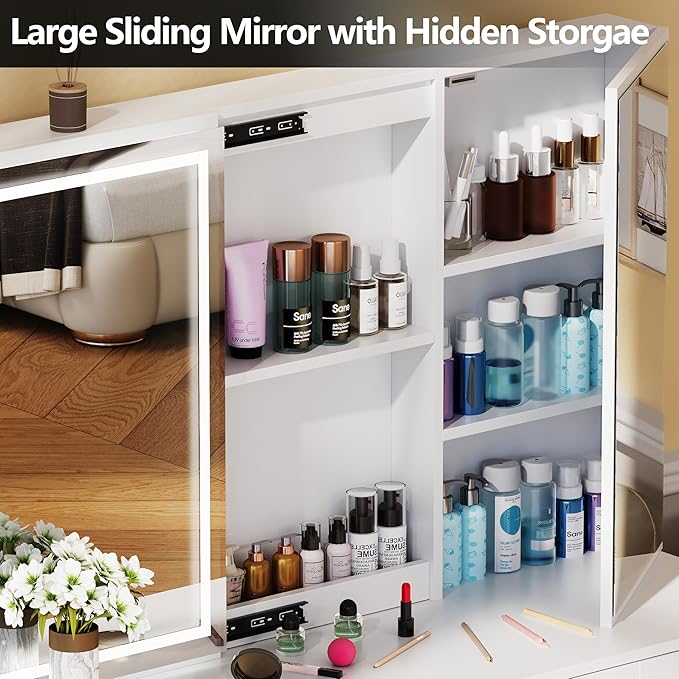 - Vanity with Hidden Jewelry Storage---Our makup vanity desk is equiped with 7 large drawers and sliding hidden jewelry cabinets & hidden cosmetic storage, perfect large storage to orgnaize your makeup accessories. The main drawer can store glasses, skincare, perfumes. The hidden jewelry cabinet can be used exclusively for storing and displaying jewelry, the right hidden storage can be used to keep; Keep your bedroom and desktop organized