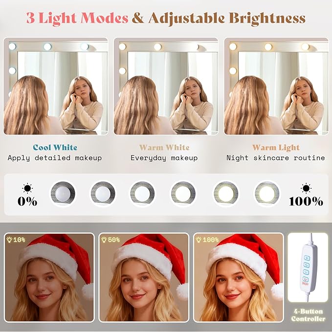 - 【Mirror with Adjustable Lighting】 Customize your glow with 3 color modes—Warm, Natural, and Cool. Press button to switch, hold to steplessly adjust brightness. This LED vanity desk is perfect for makeup anytime.