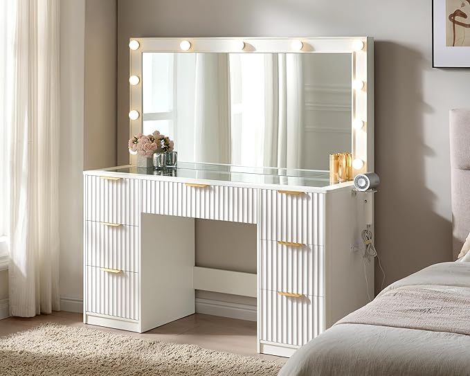 AMERLIFE 47.2" Fluted Vanity Desk with Large Mirror and Adjustable LED Lights, 7 Drawers Makeup Table with Glass Top and Charging Station for Women and Girls, Bedroom or Dorm, White