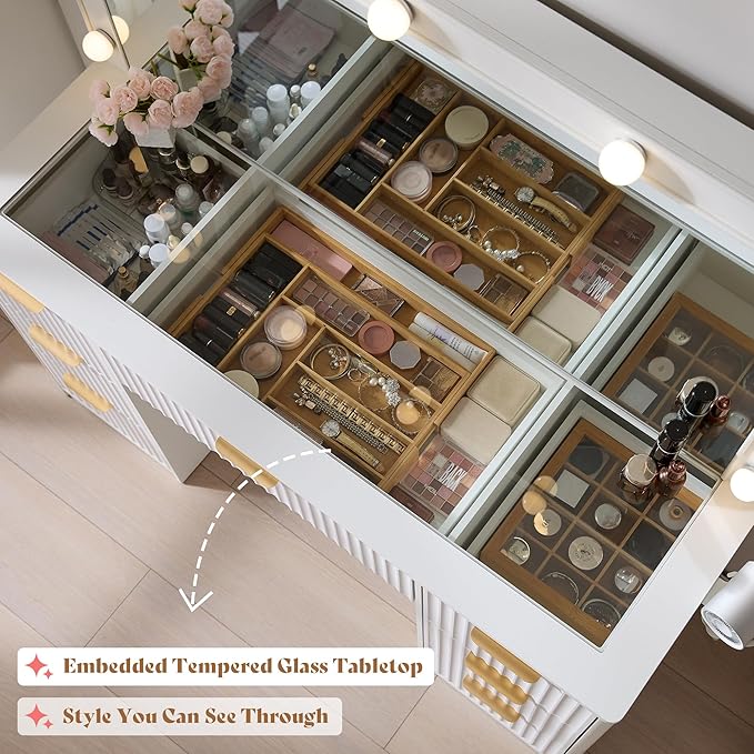 - 【Large-Capacity Storage】 This vanity desk features 7 drawers, a tempered glass top, and a full-size LED mirror to keep your cosmetics, jewelry, and accessories organized and easily visible