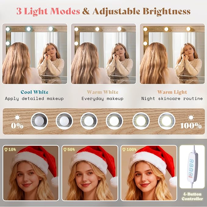- 【Mirror with Adjustable Lighting】 Customize your glow with 3 color modes—Warm, Natural, and Cool. Press button to switch, hold to steplessly adjust brightness. This LED vanity desk is perfect for makeup anytime.
