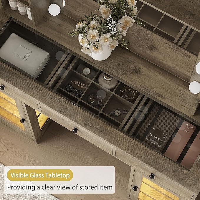 Makeup Vanity Desk with Mirror and Lights, Glass Top Vanity Table Set with Drawers & Power Outlet, Large Dressing Table with 3 Color Lighting Modes & RGB Cabinets for Women Girls Kids Bedroom, Grey