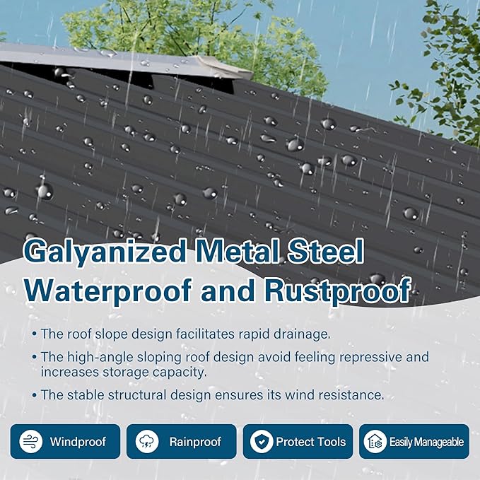 - â ăEffective Weather ProtectionăCrafted for real-world durability, the sloped roof ensures efficient rainwater drainage, minimizing the risk of pooling or leaks. This practical design helps keep maintenance low while ensuring your stored items remain dry and well-protected, even during heavy rain