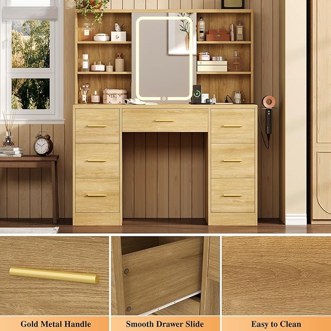 47'' W Large Vanity Desk with Mirror and Lights, 8 Storage Shelves 7 Drawers Vanity Table, Big Makeup Vanity Desk with 3 Lighting Modes, Vanity Dresser with Charging Station, Sliding Mirror (Natural)