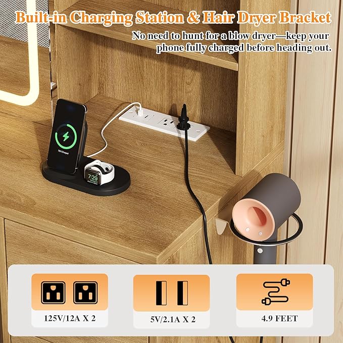 - 【Convenient Charging Station】The makeup desk is equipped with 2 USB ports and 2 AC power outlets, eliminating the need for extra power strips and preventing cable clutter. You can easily charge your phone while doing your makeup or working, ensuring you never leave home with a low battery. The fixed hairdryer holder also makes it convenient to find your hairdryer when you need it, saving you time and hassle