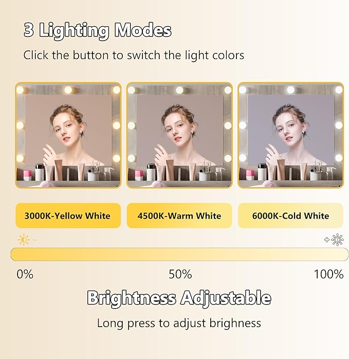 - Vanity Desk with Adjustable Lighting – BORNOON small makeup vanity desk features a large mirror surrounded by seven LED bulbs, offering three lighting modes: warm white, natural white, and cool white. With adjustable brightness, you can create the perfect lighting for makeup, live streaming, or salon use