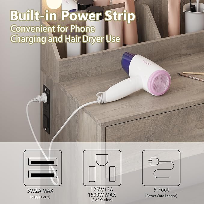- Built-in Power Outlets and USB Ports - Stay connected while getting ready with the integrated charging station, featuring two AC outlets and two USB ports. Conveniently use hair tools, charge your phone, or power beauty devices without leaving your seat