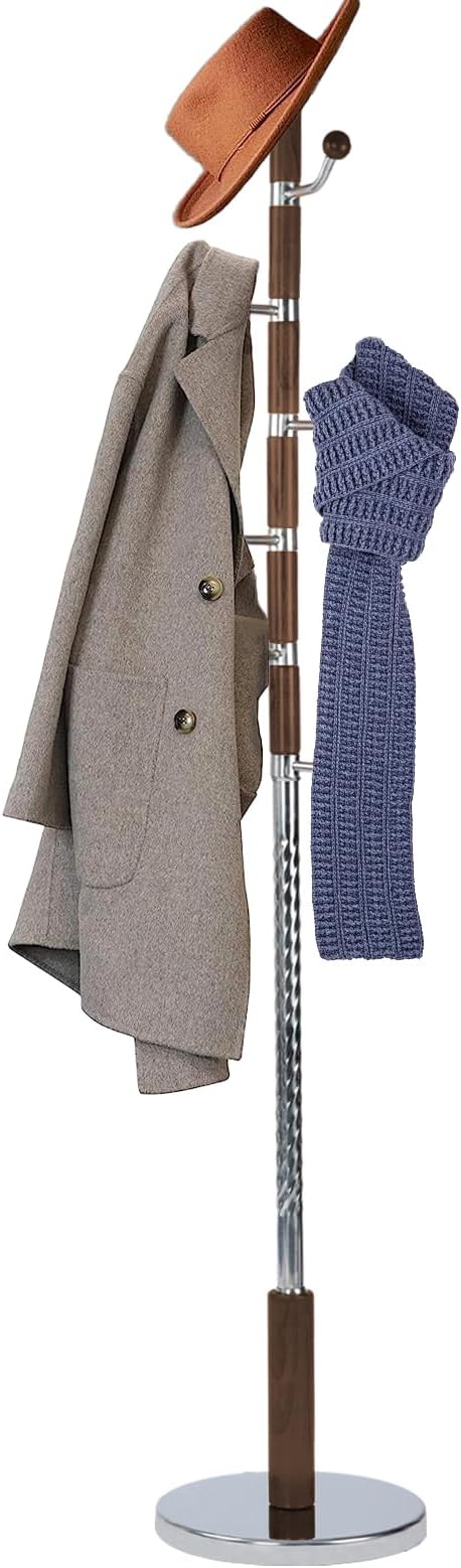 73 in Wood Coat Rack, Coat Rack Freestanding with Stable Round Base, Adjustable Height Tree Coat Racks Stand for Home Bedroom Office Hallway Entryway (Walnut Metal Hook)