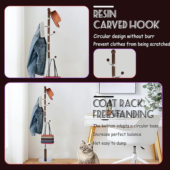 - Sturdy and Stable:The wooden coat rack is carefully selected from natural birch wood. ensures stability. exquisite resin hooks with smooth lines, hard and unbreakable. coat stands for entryway smooth and free of burrs, and it can be hung without damaging clothes