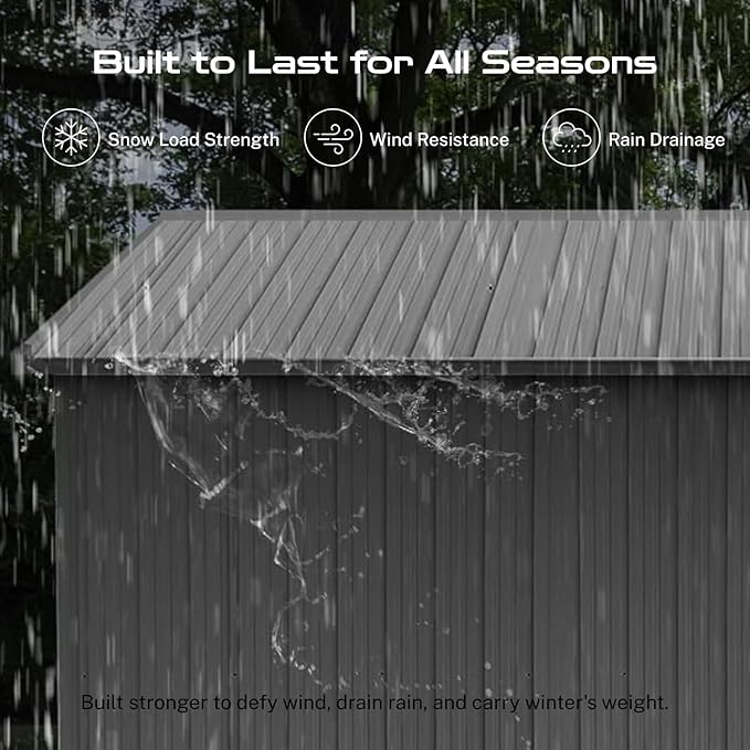 - ☔ [Sloped Roof for Superior Weather Protection] Designed for real-world conditions, the efficient sloped roof system guarantees optimal rainwater drainage, preventing damaging pooling and leaks. This key feature in our storage buildings and sheds clearance design minimizes maintenance and ensures your tools, equipment, and belongings stay consistently dry inside