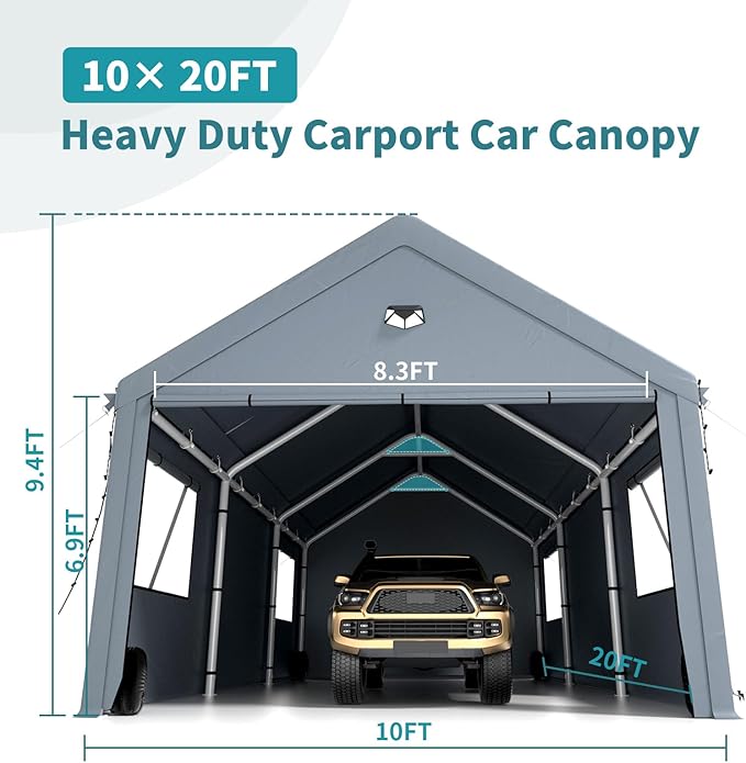 - 【Great Value】: Our 10x20 carport offers excellent value for money with our high-quality materials, versatile design. In addition to the carport itself, your purchase includes a free set of solar lights, a light belt, bindings and windproof weighted sandbags, making it a complete package that provides even more value for your money.