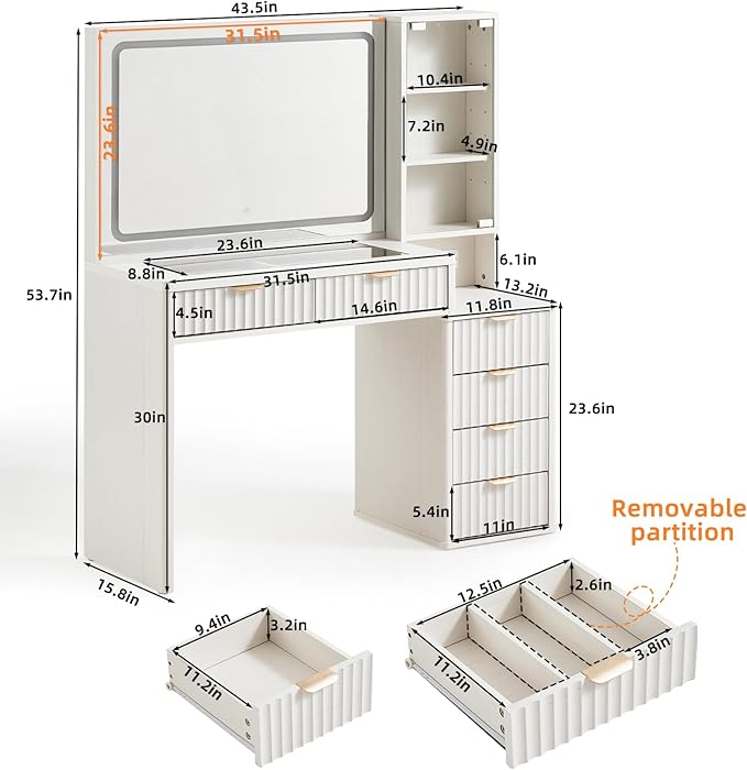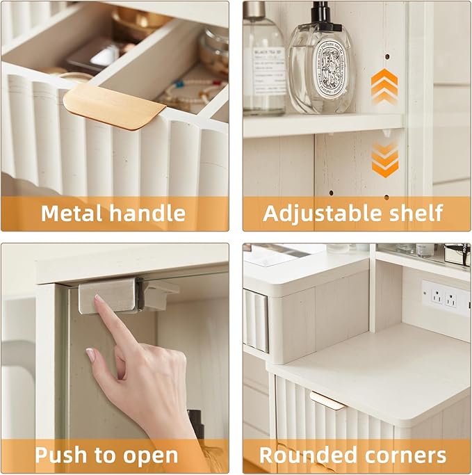 - Fluted Vanity Desk Set with Stool : The makeup vanity features an exquisite groove texture, exuding a premium feel.With a large mirror and adjustable lighting and the matching chair, this fluted-style makeup vanity looks flawless from every angle. The built-in charging station allows every woman to style herself while watching her favorite shows. The light from the illuminates the HD tempered glass surface, making your watches and jewelry in the drawers sparkle brilliantly.