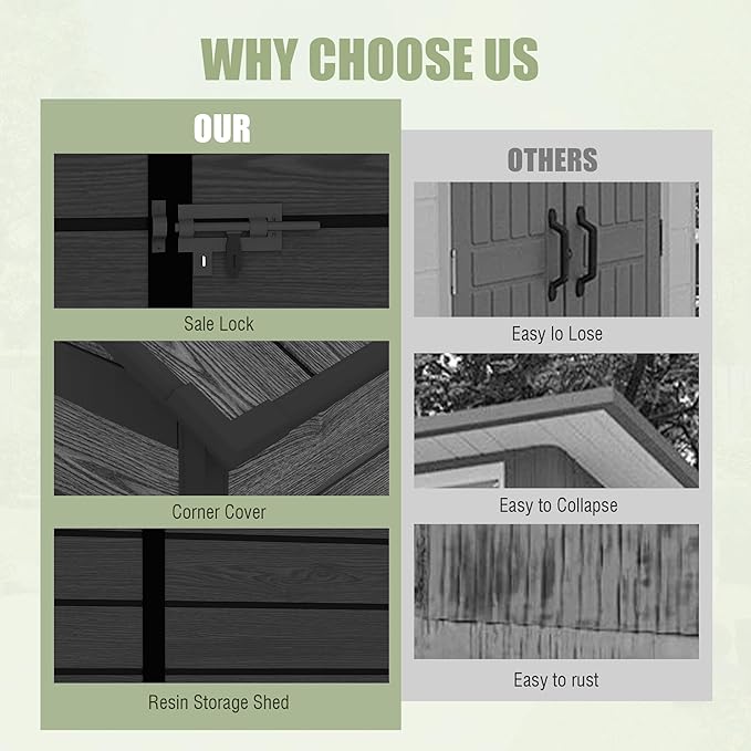 - â ăAll-Weather Resin DurabilityăConstructed from high-quality plastic resin, this resin shed is designed to endure various weather conditions, including rain, snow, and intense sunlight. The waterproof and UV-resistant exterior ensures your stored items remain protected throughout the year. Reinforced double-wall panels provide added strength and thermal stability, making this shed a reliable choice for long-term outdoor use