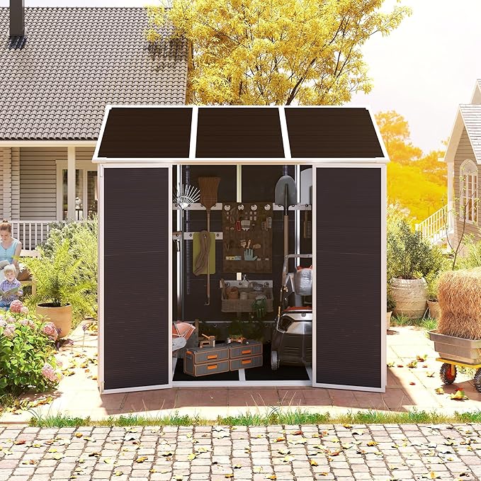 - â ăAll-Weather Resin DurabilityăConstructed from high-quality plastic resin, this resin shed is designed to endure various weather conditions, including rain, snow, and intense sunlight. The waterproof and UV-resistant exterior ensures your stored items remain protected throughout the year. Reinforced double-wall panels provide added strength and thermal stability, making this shed a reliable choice for long-term outdoor use