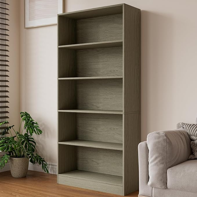 Wood Bookcase 5-Shelf Freestanding Display Wooden Bookshelf for Home Office School (Grey Oak)